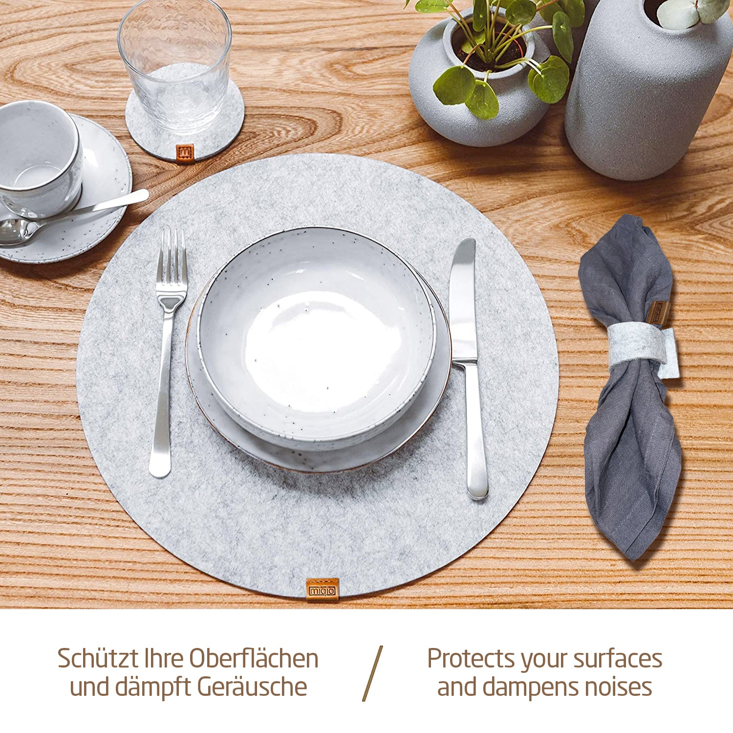 PFLEGELEICHT UND WASCHBAR: MIQIO Design Serviettenringe bestehen aus pflegeleichtem Filz. Dieser ist besonders strapazierfähig und Flecken lassen sich gut abwaschen. Auch Maschinenwäsche ist möglich - bis 30 Grad im Wollwaschgang.